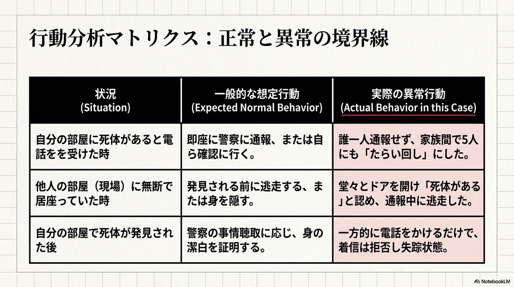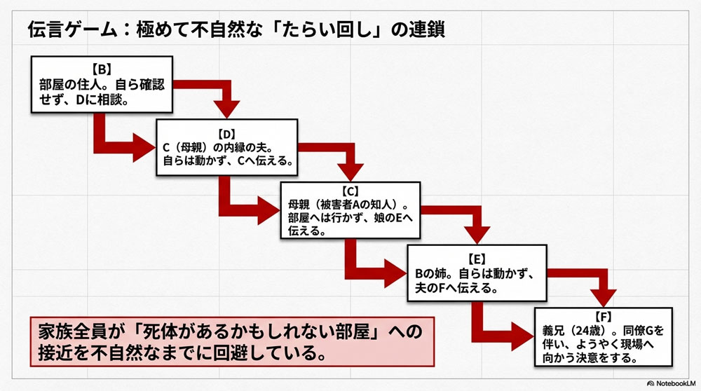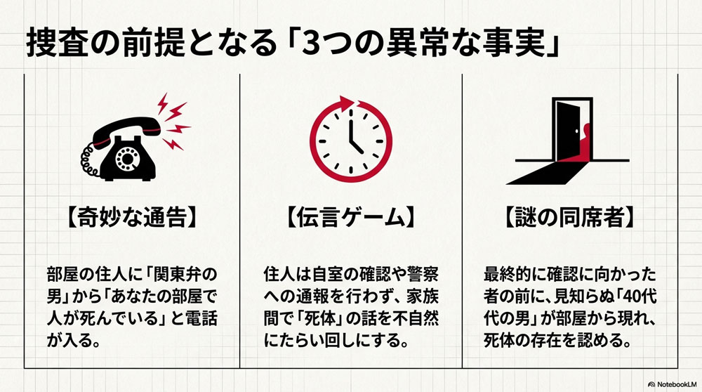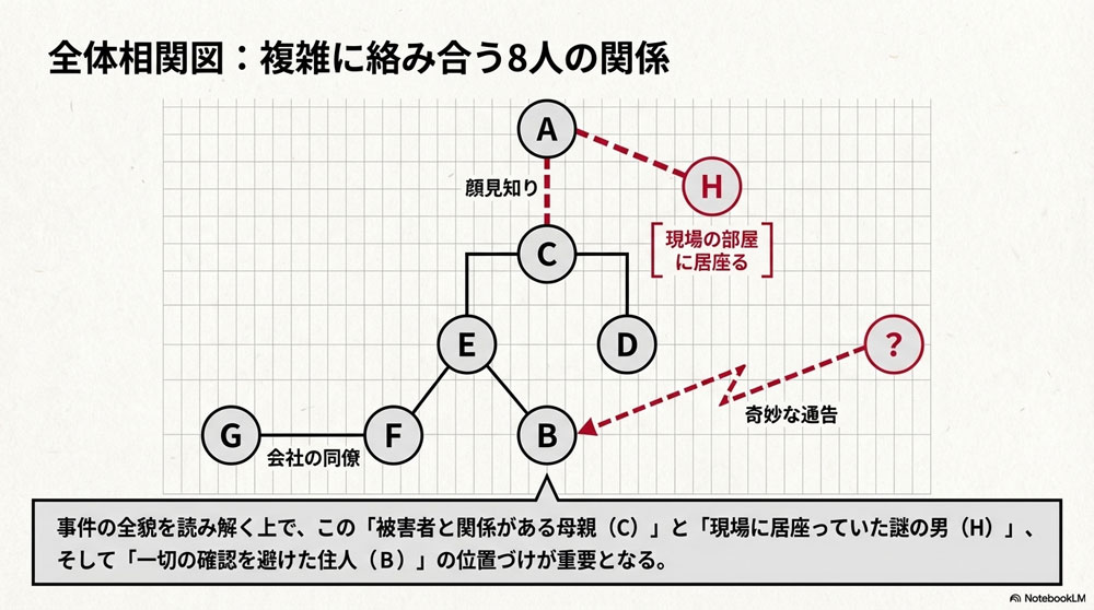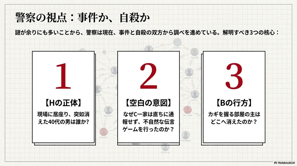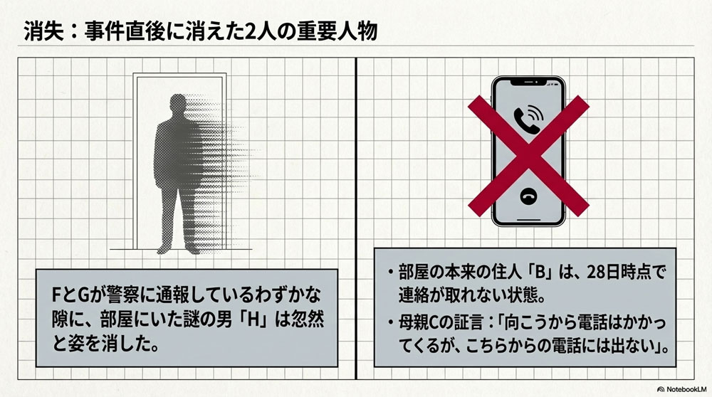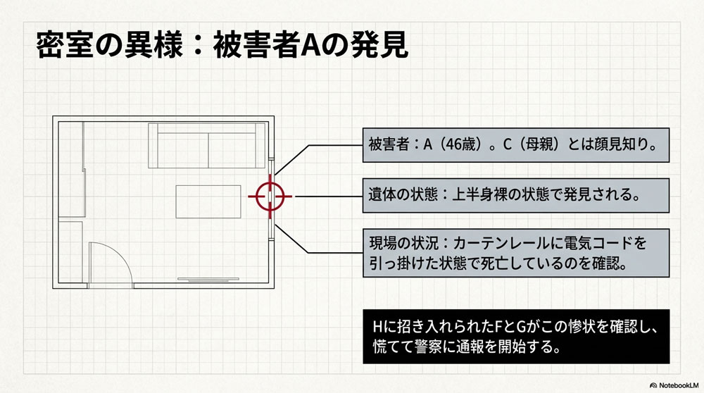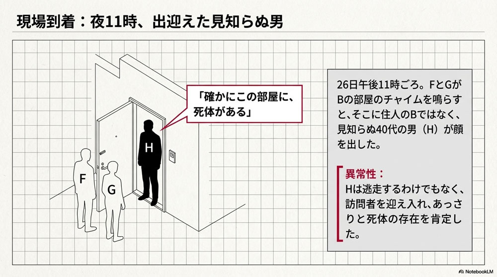 現場の状況: 発見時、部屋には本来の住人であるBではなく、正体不明の男Hが滞在していました。