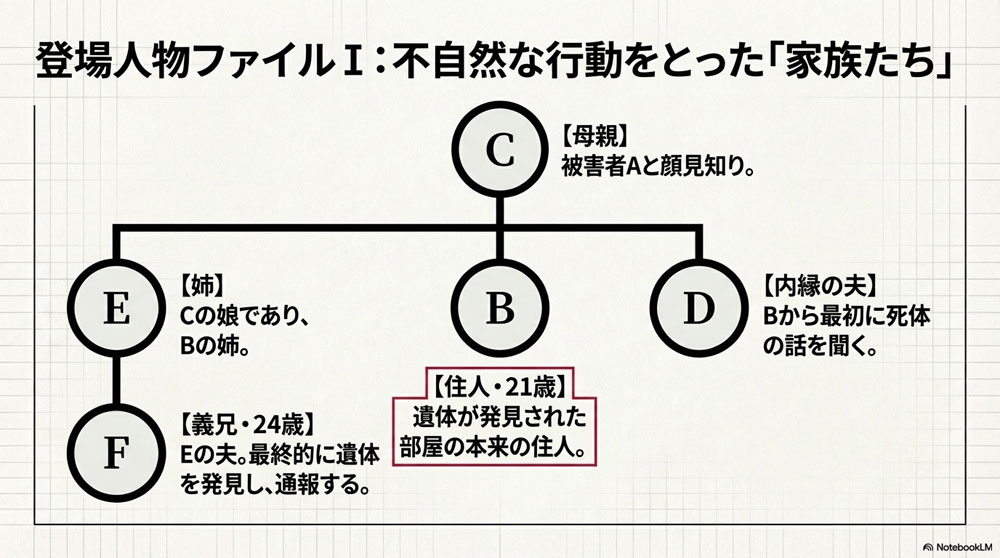 A(46歳): 遺体として発見された人物です。部屋の住人であるBの母親(C)とは顔見知りでした。