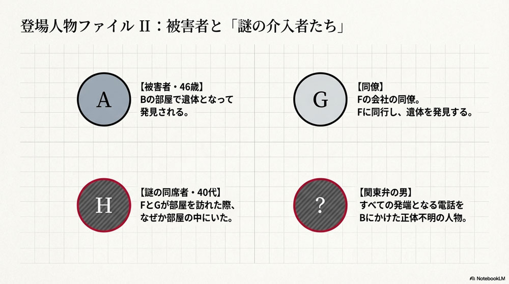 H(40代): FとGがBの部屋を訪れた際、部屋の中にいた見知らぬ男です。遺体があることを認めて二人を部屋に招き入れましたが、警察への通報後に姿を消しました。
