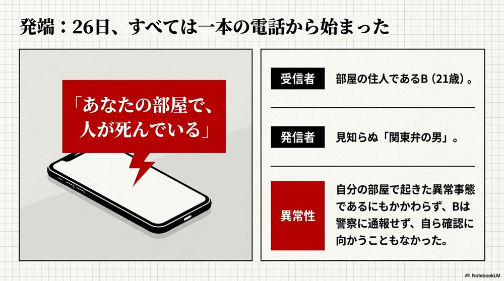 B(21歳): 遺体が発見された部屋の住人です。26日に「関東弁の男」から「あなたの部屋で人が死んでいる」という電話を受けましたが、自分では確認に行かず家族に相談しました。現在は連絡が取れない状態。