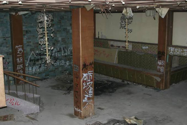 この廃墟は暴走族などの反社会勢力のたまり場になり、内部には侵入者によって破壊されたり落書きされた箇所が至る所に見られる。