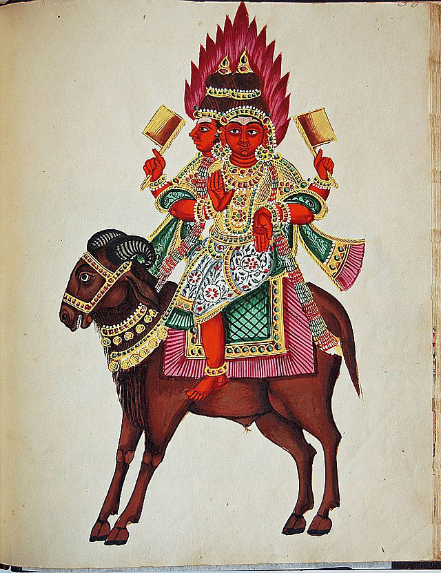 赤色の体に炎の衣を纏い、二面二臂で七枚の舌を持つ姿で描かれることが多い。ディヤウスとプリティヴィーの息子とする説もあるが、ブラフマーの創造した蓮華から誕生したとする説や、太陽または石から生まれたとする説もある。また、誕生後すぐに両親を食い殺したともいわれる。