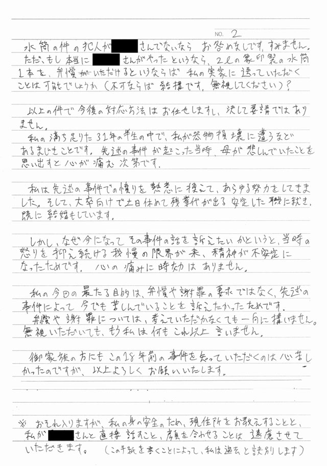 私の今回の最たる目的は、弁償や謝罪の要求ではなく、先述の事件によって今でも苦しんでいることを訴えたかったためです。