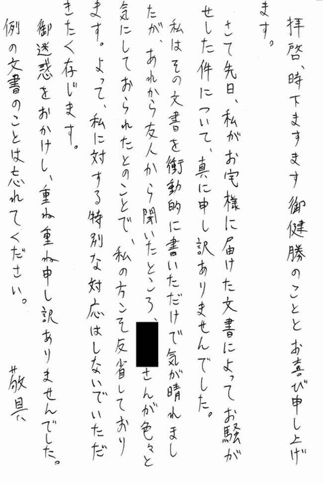 さて先日、私がお宅様に届けた文書によってお騒がせした件について、真に申し訳ありませんでした。