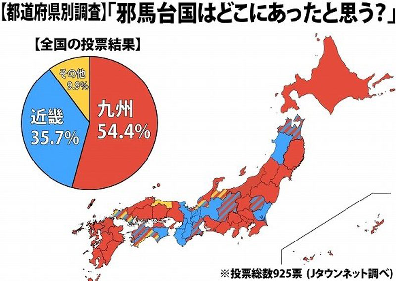 そこでJタウン研究所は2015年10月19日から12月2日までの45日間、「邪馬台国はどこにあると思う?」というテーマで、都道府県別にアンケート調査を実施した。選択肢は「九州」・「近畿」・「その他」の3つ。