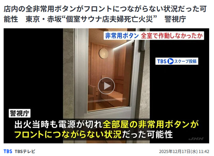 店内の全非常用ボタンがフロントにつながらない状況だった可能性 東京・赤坂“個室サウナ店夫婦死亡火災” 警視庁