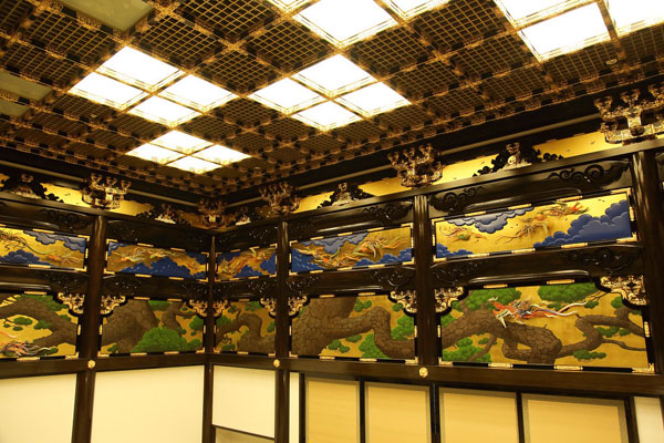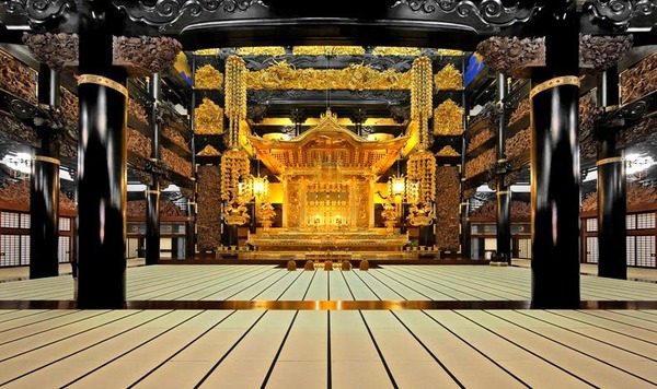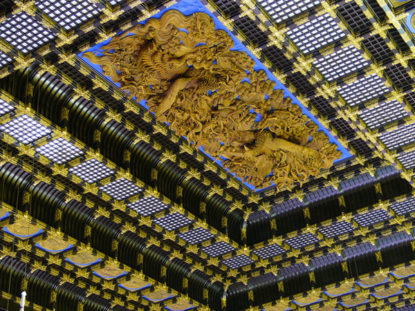 本堂の天井。これでもかという規模と量の木彫り彫刻