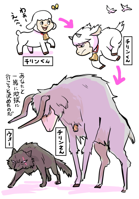 『チリンの鈴』の3年後チリン酷く痩せてるでしょ。他の動物達を殺して回ってるけど、身体が羊だから食えるわけじゃない。