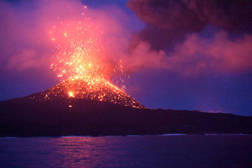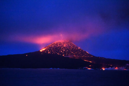 画像 夕闇のなか、赤く輝く溶岩片を噴き上げる西之島=16日午後7時15分、東京・小笠原沖の客船「にっぽん丸」から、写真家・三好和義氏撮影