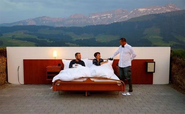 屋根も壁もない寝室で眠るホテル、スイスのアルプスに登場