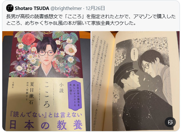 長男が高校の読書感想文で「こころ」を指定されたとかで、アマゾンで購入したところ、めちゃくちゃBL風の本が届いて家族全員大ウケした。