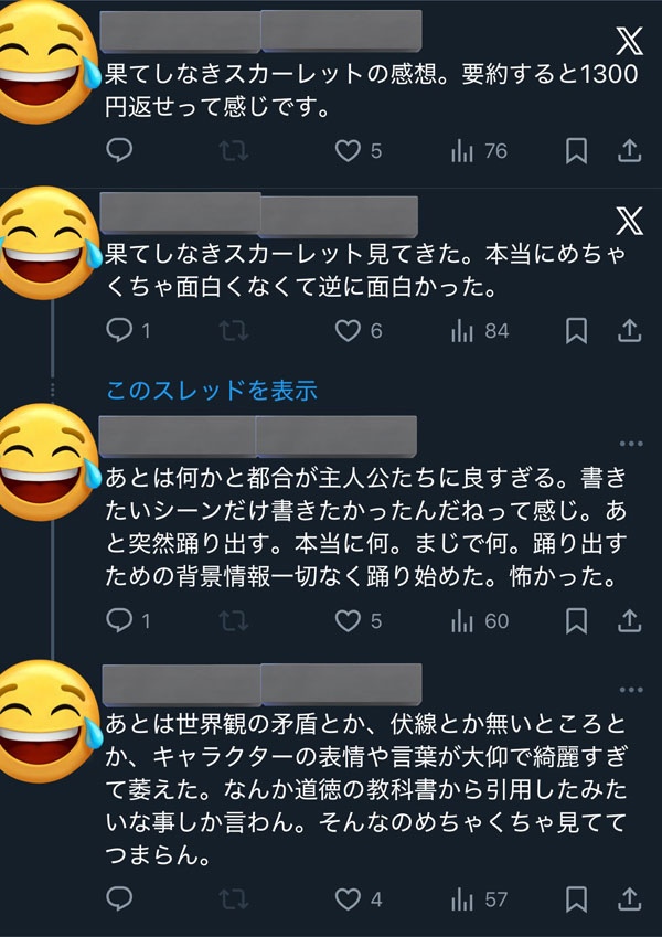 気が狂ったように淫夢を擦ってたフォロワーが果てしなきスカーレットを見た瞬間に恐ろしい量の批評ツイートを普通の言葉でし始めてショック療法って本当に効果があるんだって思った