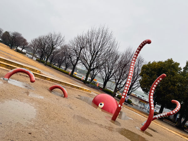 雨の公園 水たまりからタコ