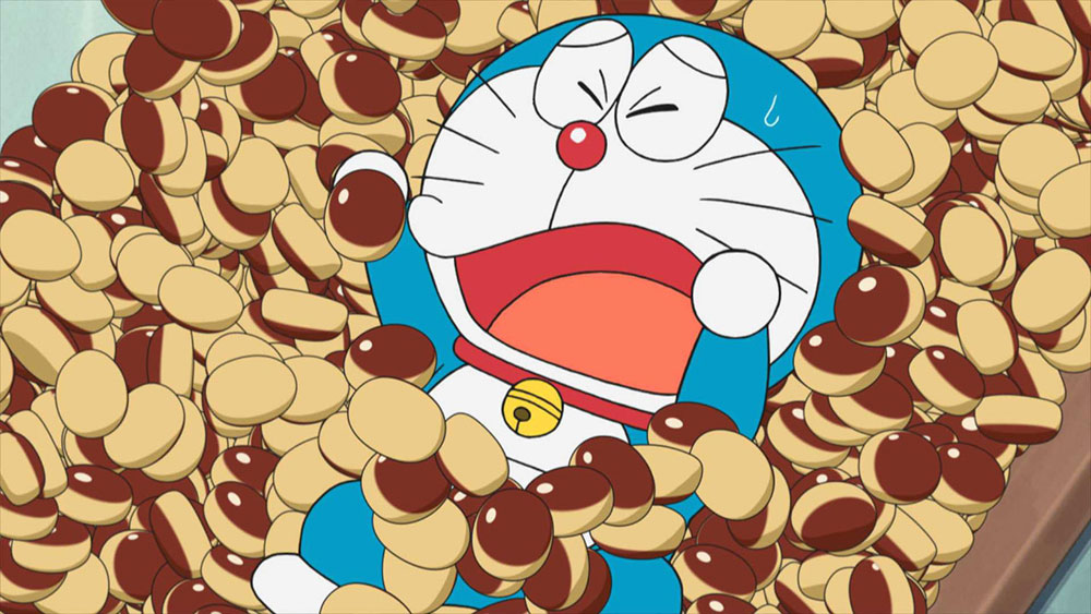テレビアニメ第2作第1期「バイバイン」(1979年12月26日放送)、および映画『ドラえもん のび太の新魔界大冒険 ~7人の魔法使い~』では、宇宙に無数の栗まんじゅうが漂っている場面が描かれている。