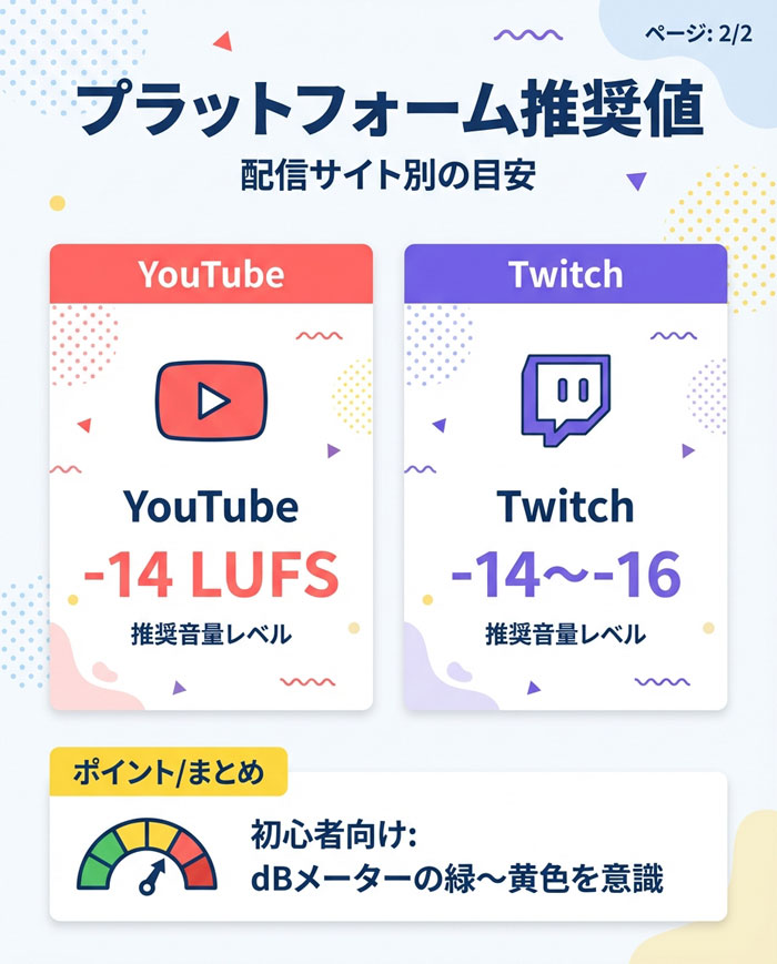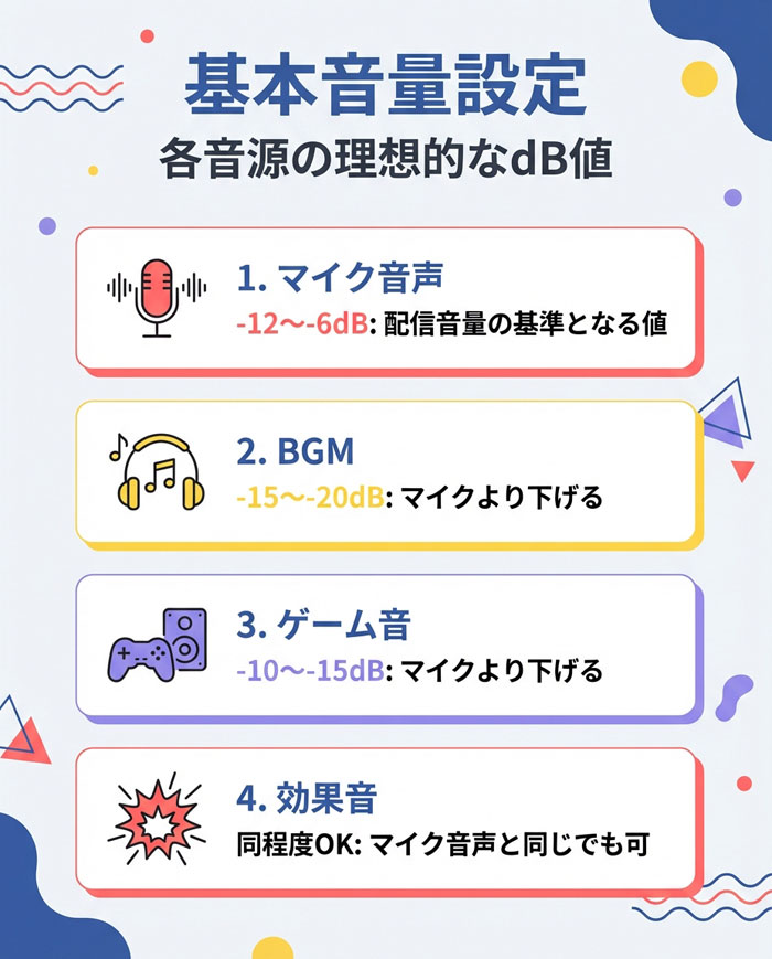 ・ゲーム音:マイクより-10dB〜-15dB下げる