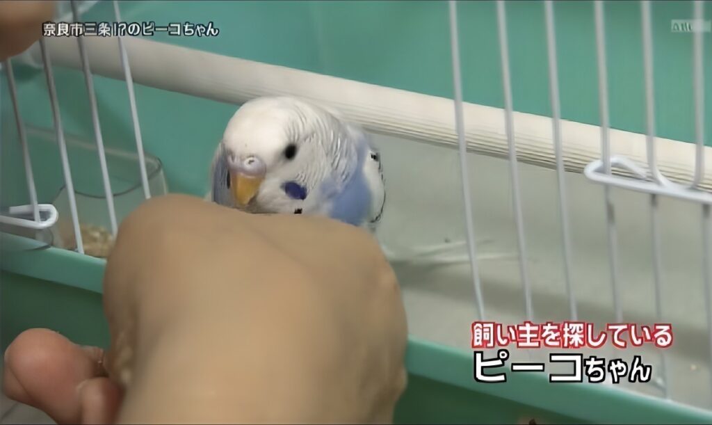 奈良市三条で発見された青いセキセイインコ「ピーコちゃん」が
