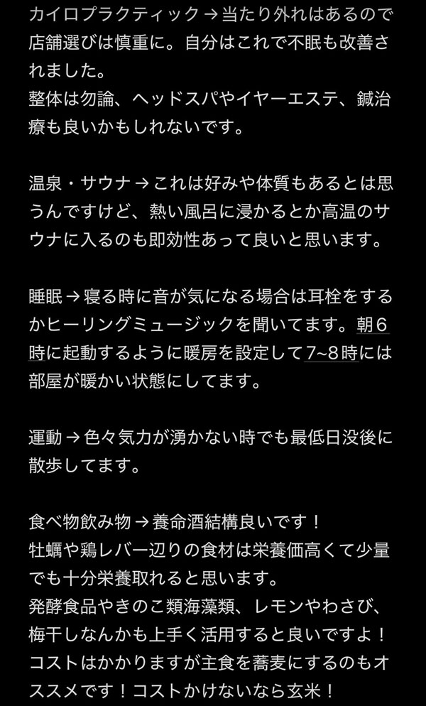 胸や背中のあたりの背骨が自律神経と関連していると聞き、寝る前にこの動きをするようにしたところ眠りが深くなり身体が楽になりました。私はこれが効かないときはめちゃくちゃ悪いので泣きながら鍼に通い詰めます。4秒吸って7秒止めて8秒吐く呼吸法もいいです。お大事にしてください。