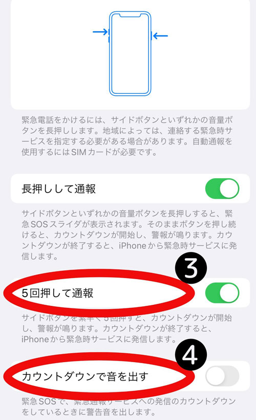 (❹通報時に周囲に音を鳴らすか鳴らさないか選択できます)