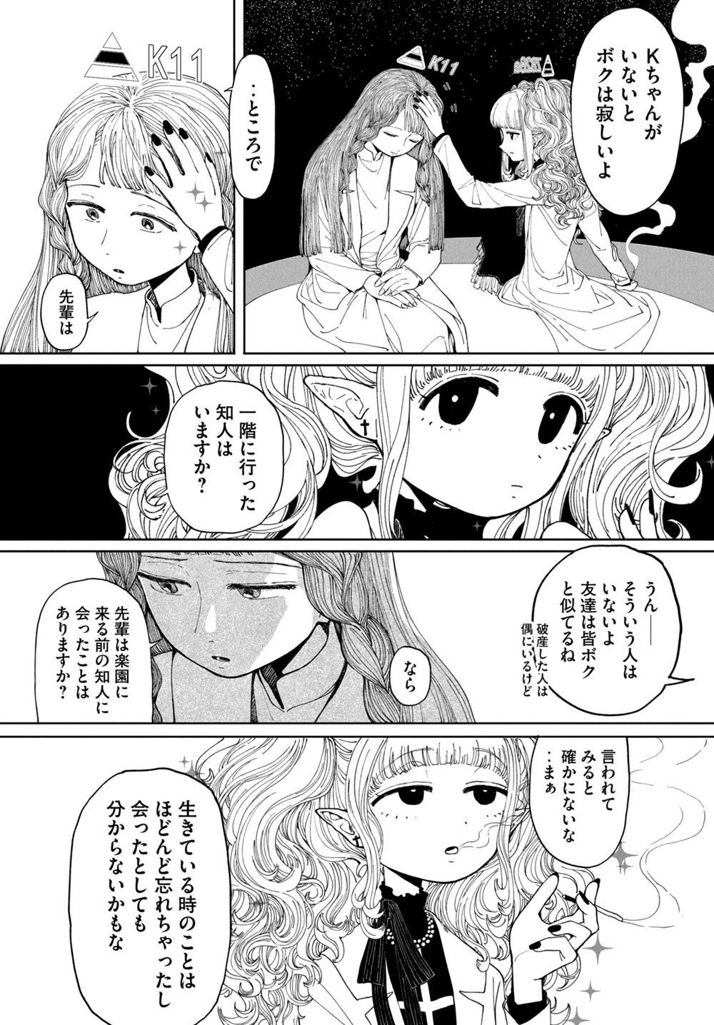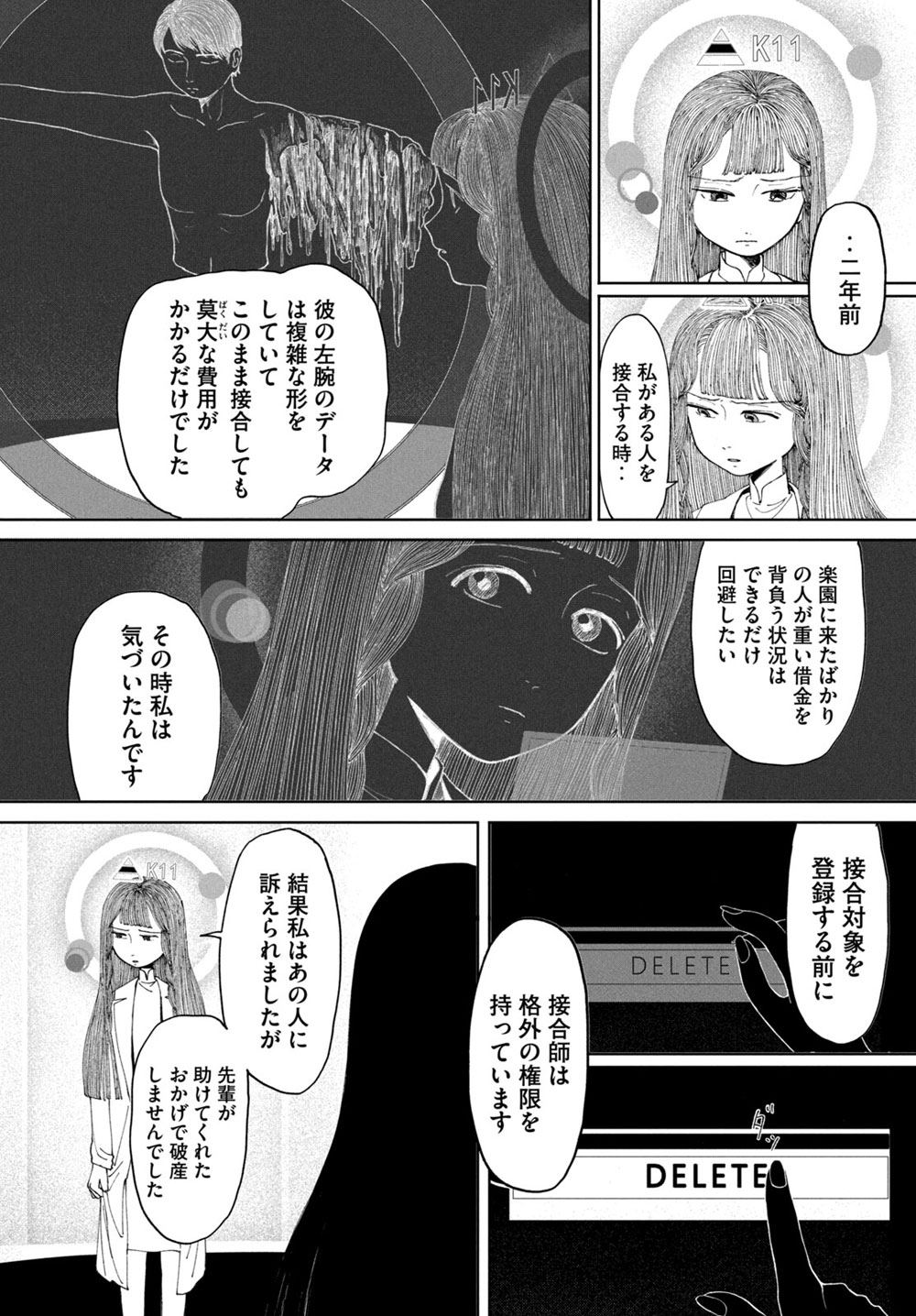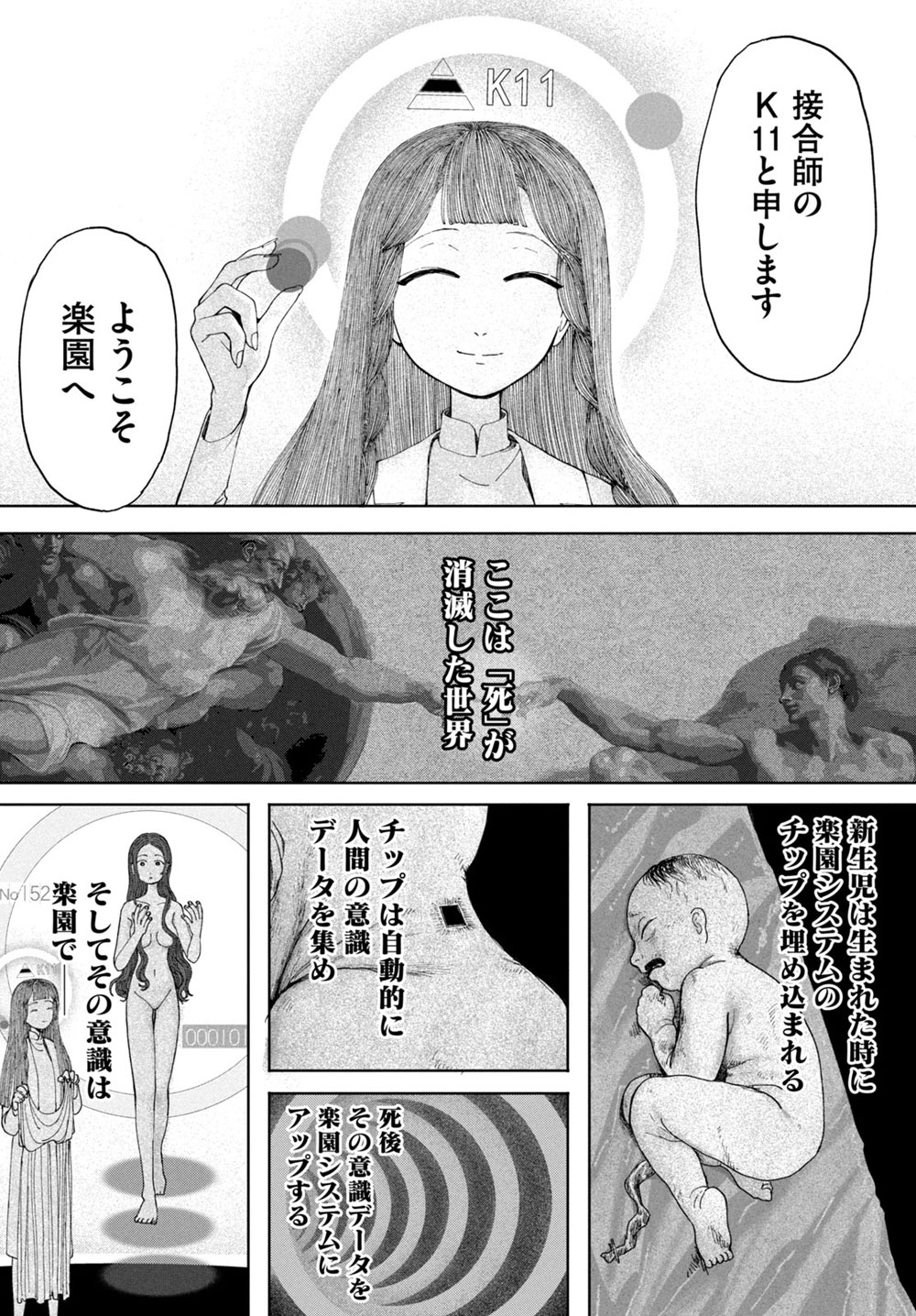 新生児にチップ→K11さんの許嫁死亡(若くても20歳ぐらい?)→K11さん老死(60歳より上に見える)→K11さん楽園50年勤務→自死タイミングが合わない開発者登場、自死タイミングで来たなら年齢がヤバい。推定150歳ぐらいになる。