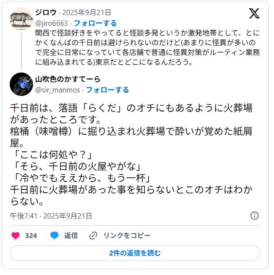 千日前ってただでさえ昔は処刑場だったし半世紀くらい前にデパートで大火事が起きて人めちゃくちゃ死んでるし、あそこまでいわくが付きまくってる場所って東京にはないような気がする。