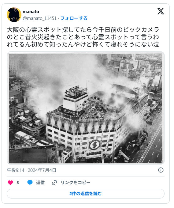 千日前デパート火災に関して心霊現象を言いたいのかもしれないけど、そういうのはたいてい思い込みや心理的な影響が原因だと思うよ。