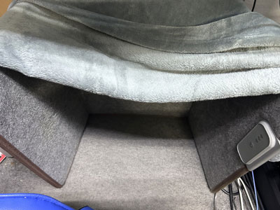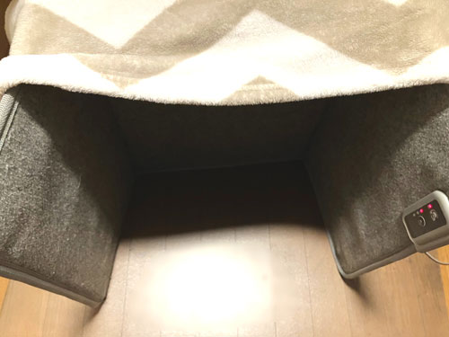 コの字型のパネルヒーターの上にひざかけのせて