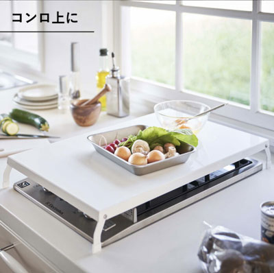料理中「あとちょっと置く場所ほしい!」ってなるやつ…コンロの上がそのまま作業台になるから、結局これが一番ラク。使わないときは折り畳めばスッキリ。ズボラでも片付いて見えるの最高。
