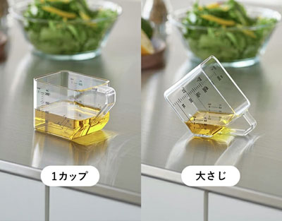 ズボラ民の味方すぎた…調理中に「アレ大さじどこ?」ってさがす時間、全部ムダ。平置きで200ml、斜めにしたら大さじ量れるってこの子天才すぎん?片手で大さじ量れるの地味にうれしいし、洗い物もまじで減って感動。料理中の小さなストレスを根こそぎ潰してくるやつ。