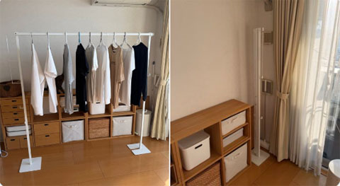 室内干しって量が増えるほど場所を取るし、生活感満載だけど、towerの折り畳み物干しは大量に干せるワイド設計、終わったら畳んで収納し、ポールハンガーになって圧迫感ゼロ。