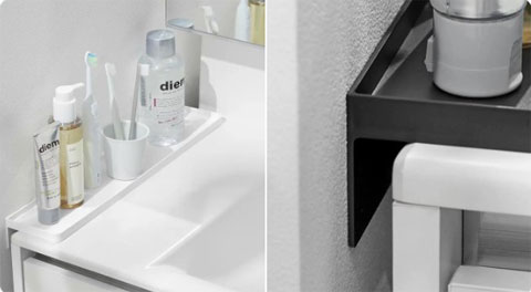 洗面台と壁の隙間に差し込んで設置するトレー。小物が落下するのを防止し、小物が置ける。奥行きが44cmで洗面台の奥の空間まで有効活用でき、ちょい置きスペースとしても便利。