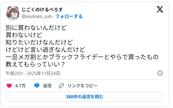 「みんなブラックフライデーで何買った?」というポストが話題になっていました。