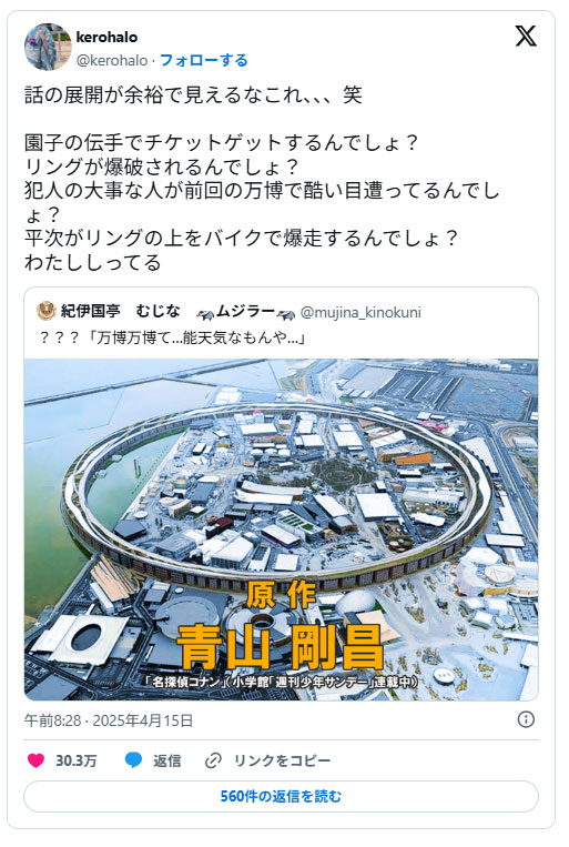 大阪万博の会場を空から取ったものが「コナンの映画に出て来たらすぐ爆破されそう」というポストから盛り上がり、エンディングまで作成されました。