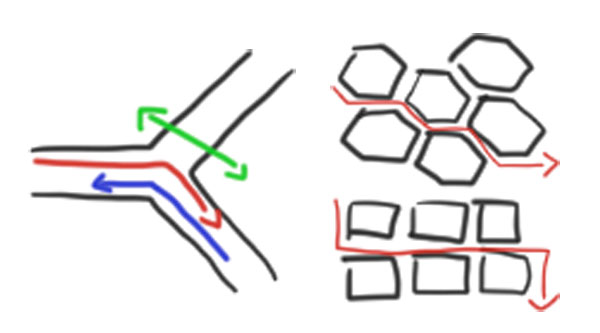 都市の形状を六角形タイルにすれば、交差点では右折時の対向車線との交差も横断歩道との交差も発生しないから交通事故はかなり減るはずだし、目的地に行く経路も碁盤の目のときに比べて最短距離に近くなると思うんだけど、なぜ六角形タイルの都市はほとんど見ないんだろうか